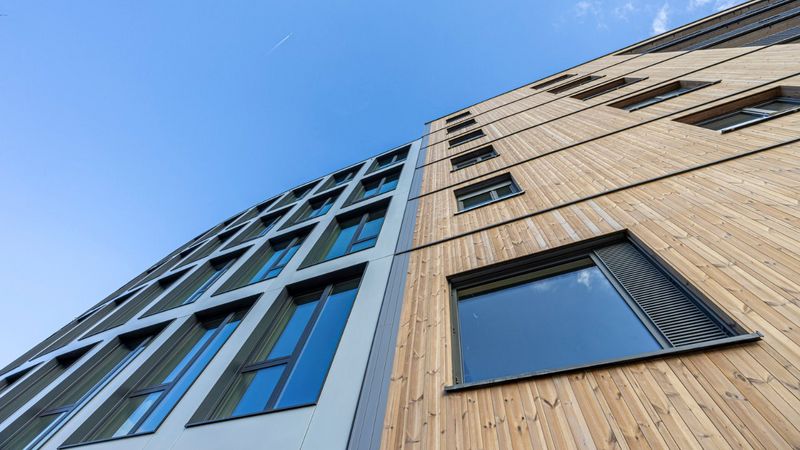 Die Technische Geschäftsführerin der FSB, Dr. Magdalena Szablewska, verweist auf die architektonische und energetische Qualität des Projekts. „Der siebengeschossige Baukörper mit seiner vorgehängten Holzfassade setzt einen markanten Akzent im Quartier. Holzkonstruktionen unterschiedlichster Art sind Teil unseres nachhaltigen Handelns“, so Szablewska. Der großzügig begrünte Innenhof – das „Grüne Zimmer“ – bildet die zentrale Mitte des Gebäudeensembles und schafft hohe Aufenthaltsqualität für die Bewohnerinnen und Bewohner sowie für die kleinen Nutzer der städtischen Kita.